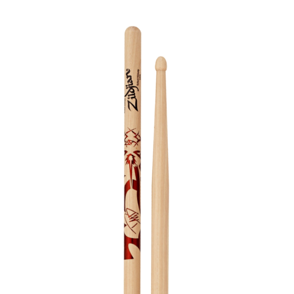 The Dave Grohl Artist Series Drumstick prominently features metallic, two-color artwork of Grohl's famous tattoos on both of his arms. This model also features large dimensions, a length of 16 3/4 and diameter of .600 for extra power and reach.  Its acorn tip delivers great sound clarity. Crafted from 100% U.S. Select Hickory, the preferred wood for drum set sticks, its overall design is especially well suited for rock applications where power, rebound, and durability are critical.