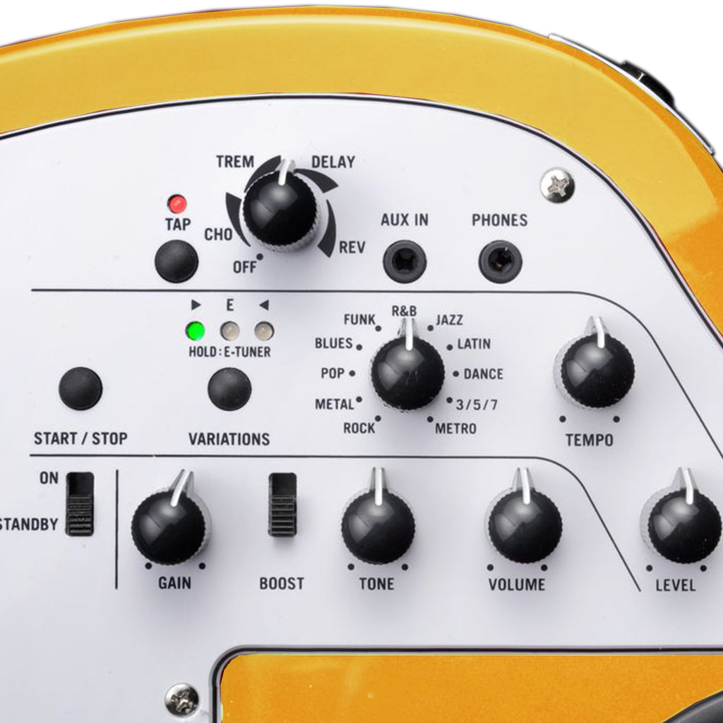 Guitar: GAIN, BOOST on/off, TONE, VOLUME Rhythm: START/STOP, GENRE VARIATIONS, TEMPO, LEVEL Effect: TAP, EFFECTS: CHO, TREM, DELAY, REV |