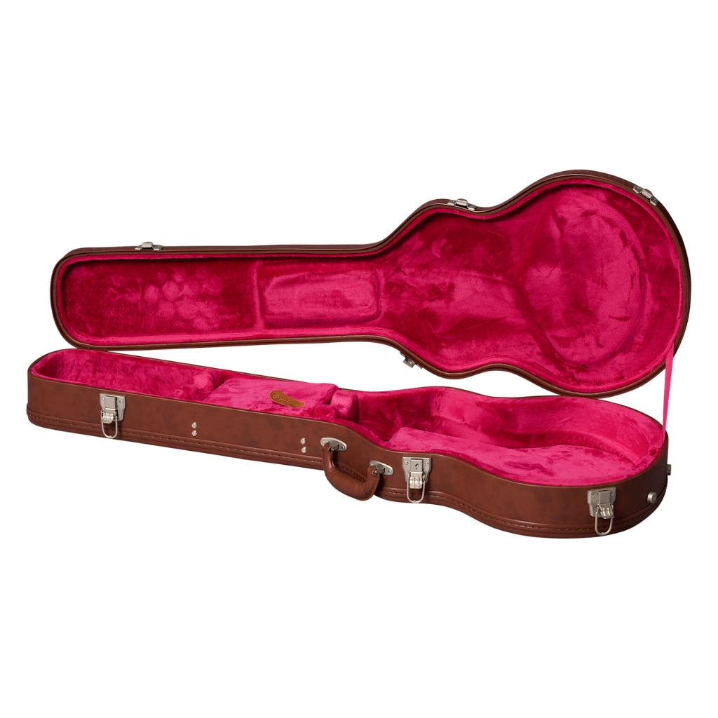 Each guitar includes a brown hardshell case with pink plush interior, inspired by Gibson Custom Shop cases.