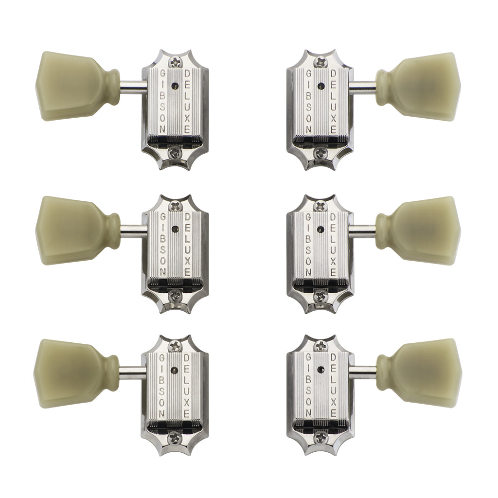 Gibson's vintage machine heads with pearloid buttons feature solid nickel, closed housing construction, period-correct vintage styling, and traditional pearloid buttons that deliver precise tuning, while adding a luxurious, classic feel to your guitar's headstock. This OEM part comes in either Nickel or Gold finish. Special note: These tuners feature screw in bushings, which require a larger diameter mounting hole than traditional 'push in' bushing tuners.