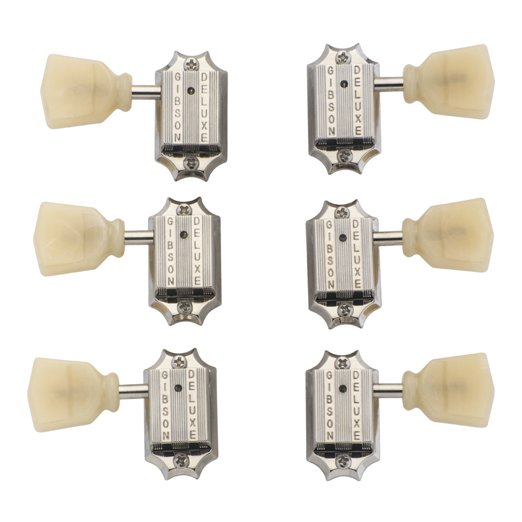 Gibson’s vintage machine heads with pearloid buttons feature solid Nickel, closed housing construction, period-correct vintage styling, and traditional pearloid buttons that deliver precise tuning, while adding a luxurious, classic feel to your guitar’s headstock. This OEM part comes in a Nickel finish. 14:1 Tuning Ratio. Special note: These tuners feature screw in bushings, which require a larger diameter mounting hole than traditional ‘push in’ bushing tuners.