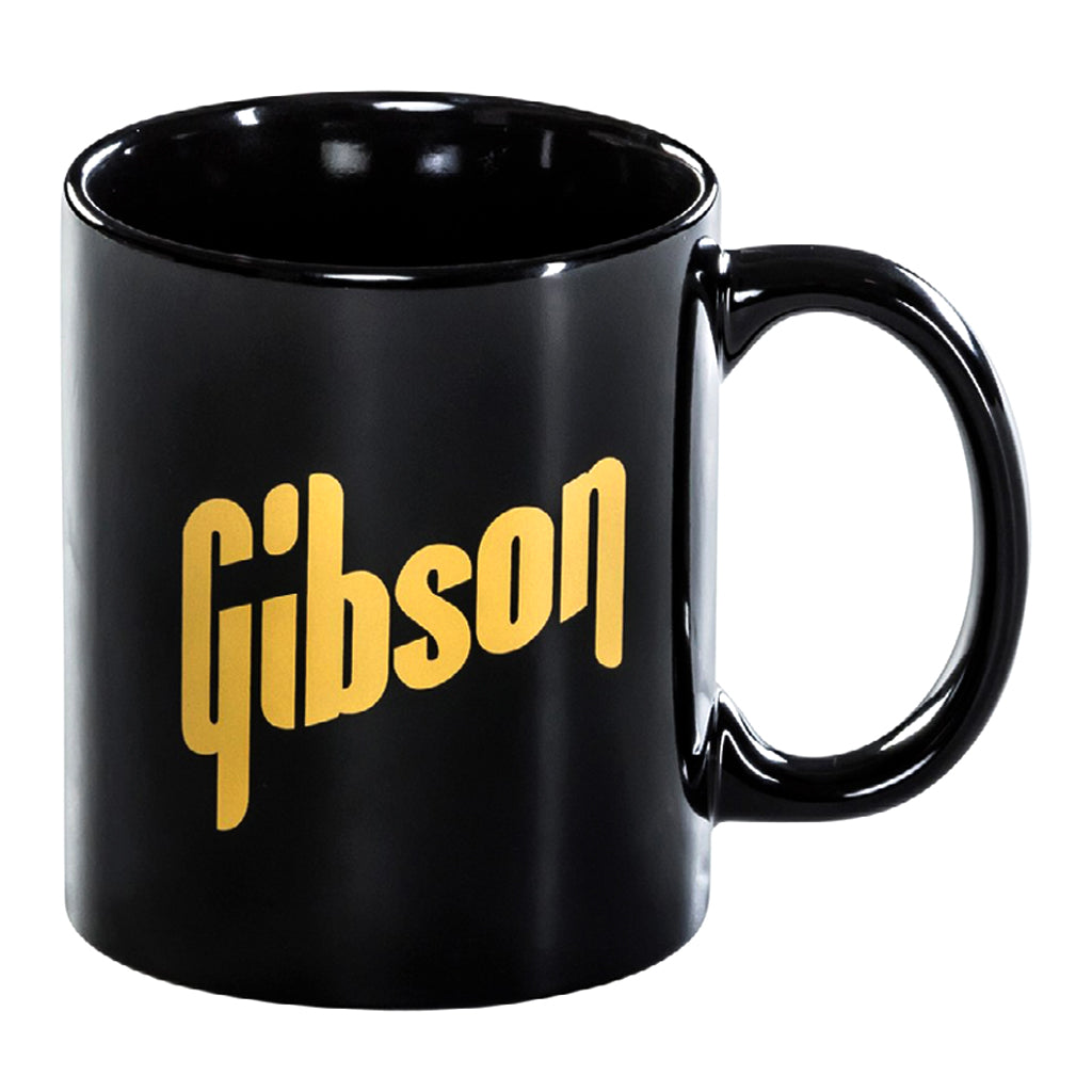 The vintage Gibson logo is featured in a shimmering Vegas Gold on a sleek eleven ounce black mug made of high gloss ceramic.