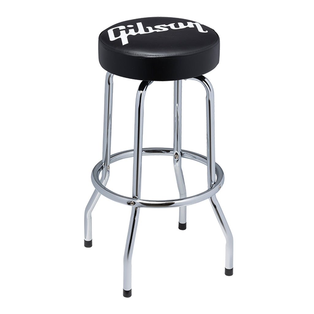 This 30 high playing stool, adorned with the Gibson logo, features a comfortable, padded vinyl seat that swivels through 360 degrees. The classic barstool-style tubular steel legs have a chrome finish, and the stool has a foot ring for added comfort.