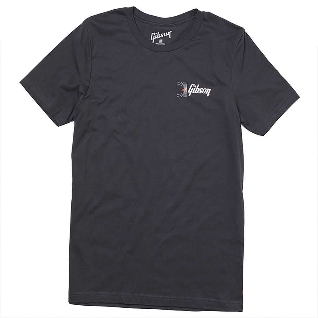 The dark grey Soundwave Tee features the Soundwave graphic found on the cover of 1960s-1980s era hang-tags that accompanied all new Gibson instruments.