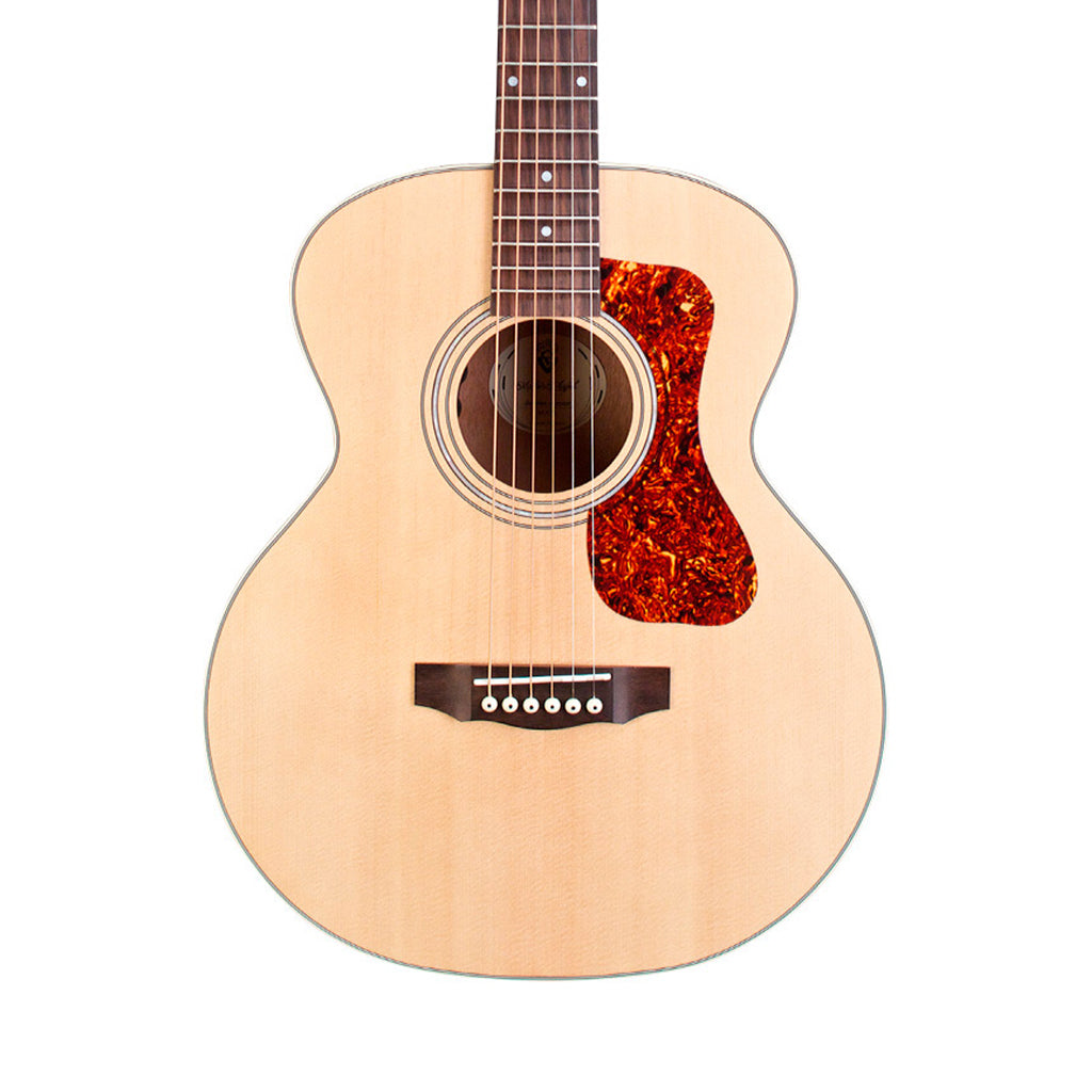 The Guild Jumbo Junior Mahogany gives you a jumbo-like body shape in a smaller size. It makes an ideal travel guitar, yet it sounds good enough to be played anywhere. The guitar features a solid Sitka spruce top combined with mahogany sides and an arched mahogany back—resulting in a full and well-balanced sound with lots of richness and sustain. The Guild Jumbo Junior Mahogany guitar also sports a pau ferro fingerboard and bridge, a real bone nut and saddle, a mother-of-pearl rosette, and a beautiful Natural satin finish. An integrated Fishman-designed GT-1 pickup system with Volume and Tone controls faithfully reproduces the guitar’s acoustic sound when it is amplified.