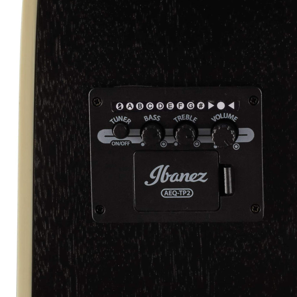 The Ibanez AEQ-TP2 preamp provides the extra punch of on-board EQ along with a convenient and easy-to-read digital tuner and 2-band EQ, located on the instrument’s upper bout. The Ibanez T-bar Undersaddle pickup accurately translates that full sound to whatever amplification system you plug it into.