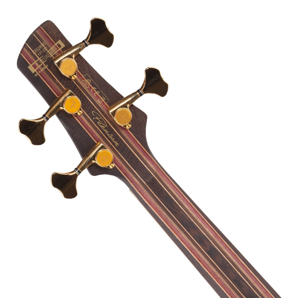 SR2600-CBB features a stunning Poplar Burl body with a gorgeous natural binding on the top and side, creating exotic and boutique feels on SR’s beautifully arched body. The Mahogany body delivers a warm tone with rich resonance. The Atlas-15 pc Panga Panga, Maple, Paduak, Purpleheart and Walnut neck provides extreme rigidity, tonal clarity, increasing sustain, and superior note attack with the Panga Panga fretboard. The slim neck grip shape permits superior playability with the meticulous Premium fret edge treatment.