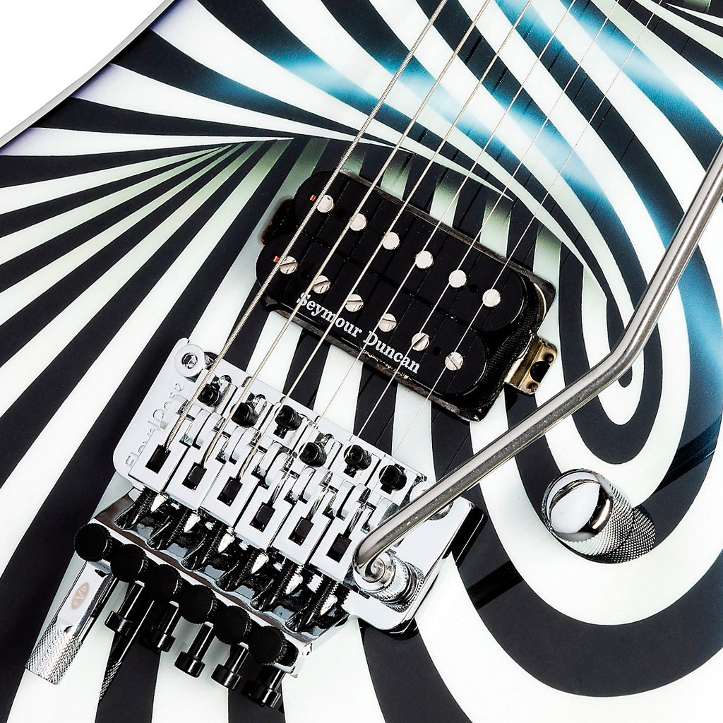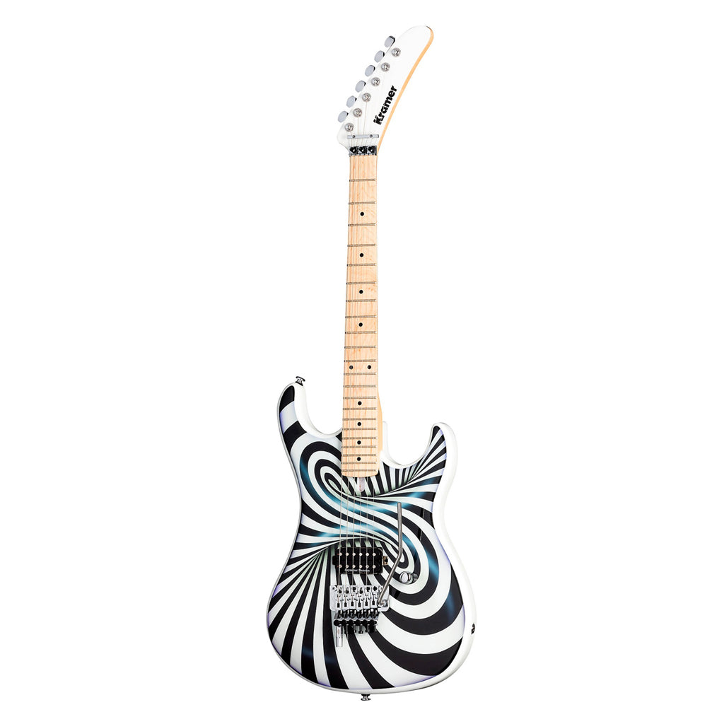 Finished in an eye-catching 3D Black/White Swirl, this is a Kramer exclusive graphic design. Designed by artist Bo Pittman, who took inspiration from hot rod motorcycle graphics, the original hand-painted model was featured at the 2020 Winter NAMM Show Kramer exhibit and was so popular that they partnered with Bo to replicate it for Kramer fans everywhere. The 84 honors Kramer's first golden age and is one of the most influential electric guitars of all time. Featuring a lightweight alder body, a Seymour Duncan® JB™ humbucker™, a push/pull volume control for series/parallel switching, a Floyd Rose® R2 1000 series locking nut, and 1000 series Floyd Rose Tremolo. It also comes equipped with an EVH® D-Tuna® and a Floyd Rose LRT-L40 Trem Stop. A premium gig bag is also included.