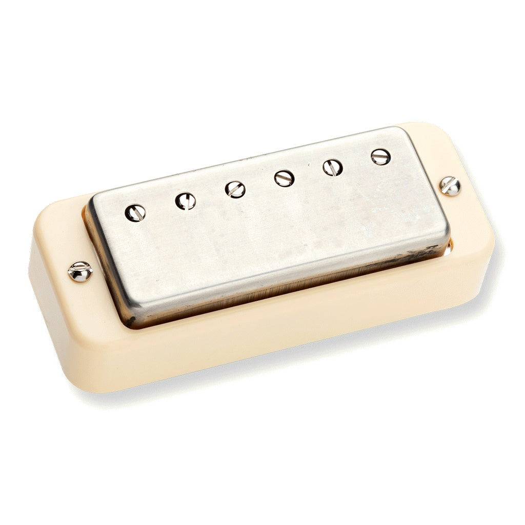 The Antiquity II Adjustable Mini Humbucker has a truly unique tonal character. Its midrange emphasis brings focus to the lows, and adds a gritty sweetness to the highs. Overdriven sounds break up nicely with a smooth, warm growl. Clean tones pop and ring with a zing that full-sized humbuckers struggle to match. Each Antiquity II Mini Humbucker is hand built and aged to look and sound like the original. We use a hand-cut P90 soapbar cover-sized mounting ring, and these pickups mount to the guitar exactly like an original Les Paul Deluxe. Staying true to this type of ’50s-era Gibson and Epiphone pickups, these vintage mini humbuckers are not wax potted, which takes you right to the edge of harmonic breakup and sustaining feedback. These can be used in any guitar with a Les Paul Deluxe or P90 (with our Tapped Mounting Plate) pickup rout.