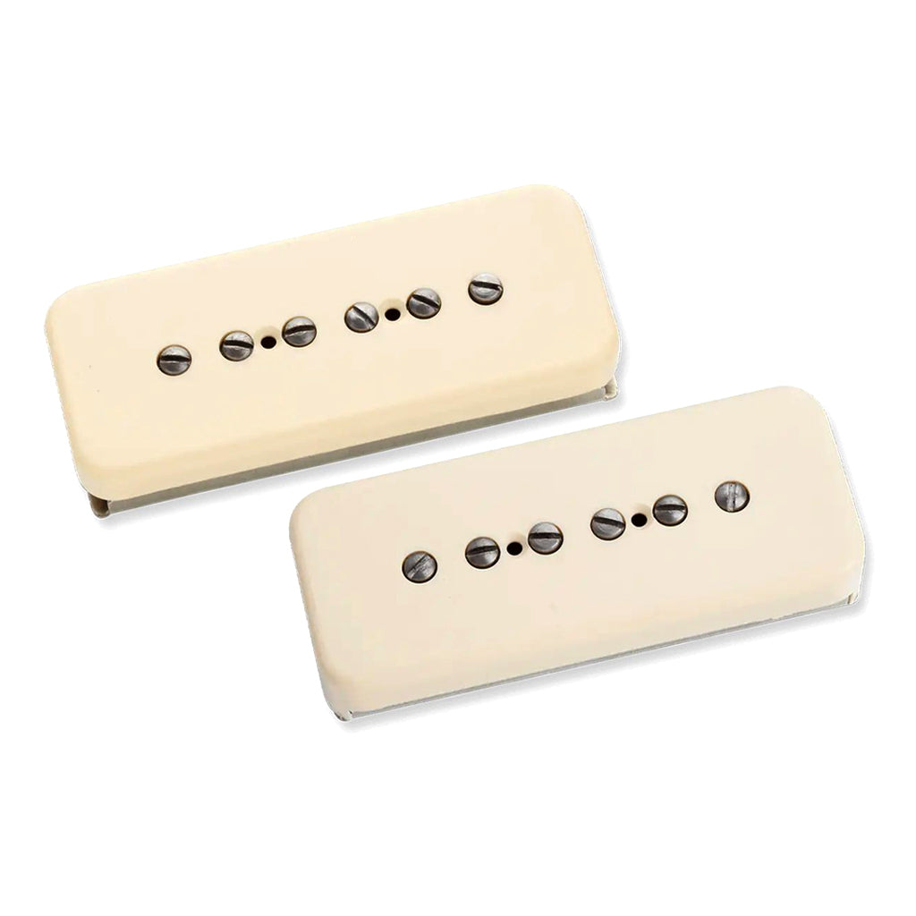 The neck model is full and round sounding, with single notes that have a sweet, musical, singing quality. It is also wound RW/RP to be hum-cancelling when engaged with a matching bridge pickup. When you remove our hand-aged soapbar covers, you’ll find the same hand-fabricated bobbin, plain enamel mag wire, and flatback tape that was made in Kalamazoo during the early days. This vintage P90 pickup is a drop-in replacement for any standard P90-sized rout, and is available in black or cream aged covers.
