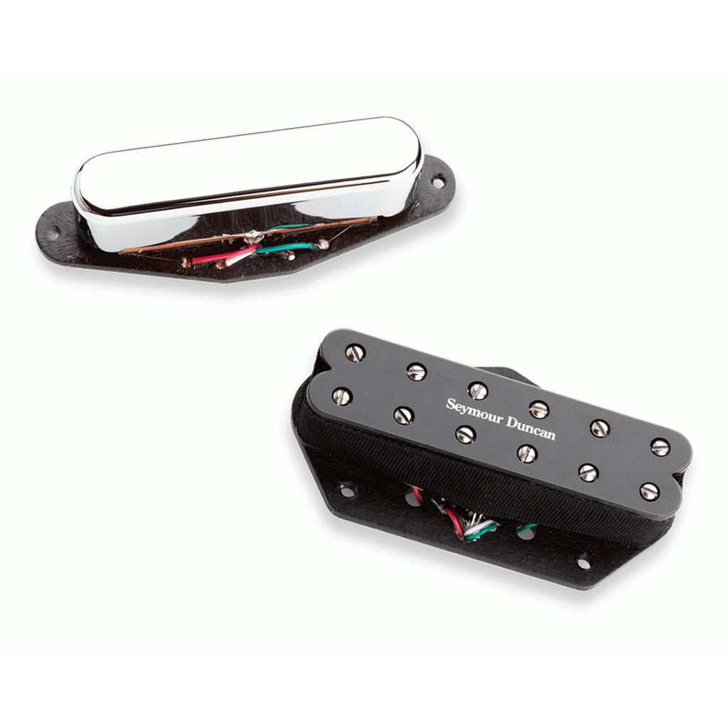 Previously unattainable rich humbucker lead tones in a standard Telecaster are now yours with our Little ’59 and Vintage Stack noiseless telecaster pickup set. The Little ‘59 for Tele is like putting a well-balanced, full sized P.A.F. into the bridge position of your Tele. This medium output, single coil sized pickup has a nice, even bass and treble response with a slightly scooped midrange that gives it that classic, full bodied humbucker sound. Great for everything from country to rock. The 4-conductor lead wire gives you access to parallel and split wiring options for added versatility. This pickup is a drop-in replacement for a Fender American Standard Telecaster sized pickup route. The Vintage Rhythm Stack is a noiseless Tele neck pickup that delivers classic output and tone. The lows are full and warm and the treble response has that classic spank. Built by hand in Santa Barbara, CA, this pickup set uses ceramic bar and alnico 5 rod magnets, a deep drawn chrome plated cover for the neck, 4-conductor lead wire, and is wax potted for squeal free operation.