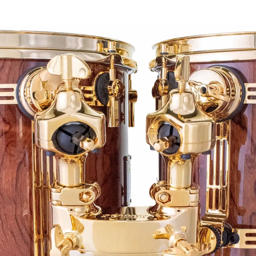 At the heart of this shell pack are the legendary 10.5mm Signature Series replica shells, constructed from 15 plies of carefully selected German beech veneer. Just like the original, genuine Bubinga is used for both the inner and outer plies, delivering exceptional resonance, projection, and tonal purity. The visually striking Bubinga Pommelé grain is showcased under a clear high-gloss lacquer, applied and polished by hand in multiple stages to highlight its natural depth and character.