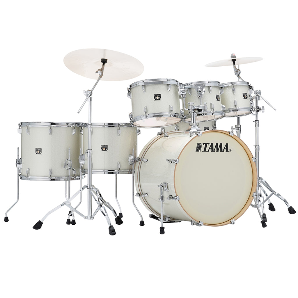Drawing on SuperStar of the past, its classic Tama T-shape badge and streamlined low-mass single lugs point to the simpler state of art of the 70's, while the ingenious Star-Mount system and new thinner gauge 100% Maple shells eclipse anything in its class This product comes in a 7-piece shell kit in a 18"x22" Bass Drum, 8"x7" Tom Tom, 8"x10" Tom Tom, 9"x12" Tom Tom, 12"x14" Floor Tom, 14"x16" Floor Tom, 6.5"x14" Snare Drum, MTH600 Double Tom Holder & MC69 Single Tom Attachment configuration. This kit comes with a SM5W Hardware pack. Designed with All-Maple Shells, Tom Tom and Floor Tom/SD: 6ply, 5mm / Bass Drum: 8ply, 7mm with a Star-Mount System, Triple Flanged Hoop, and Low-Mass Single Lugs with Claw Hooks w/Rubber Spacers. The Kit has Power Craft II drum heads and Classic Tama T-badge.